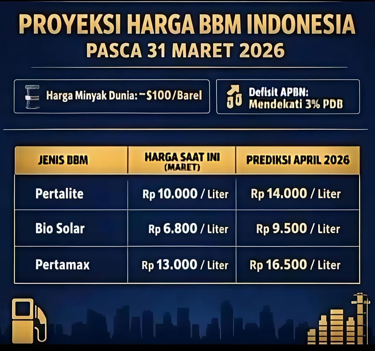 Dengan begitu, Bhima memprediksi harga Pertamax bakal naik menjadi Rp13.800βRp14.300/liter pada April 2026. Pertamina Dex diprediksi bakal naik menjadi Rp16.000βRp16.500 per liter.